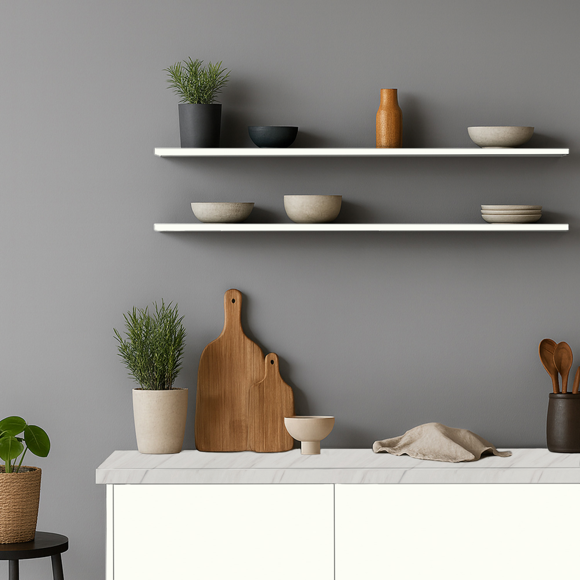 De 18 mm dunne zwevende wandplank op maat Wit (W1000 ST9 – RAL9003) biedt een strakke, helderwitte uitstraling en wordt volledig blind gemonteerd met het Italiana Ferramenta Triade Pro systeem. De plank hangt strak tegen de muur zonder zichtbare dragers en vormt een perfecte moderne basis voor elk interieur.