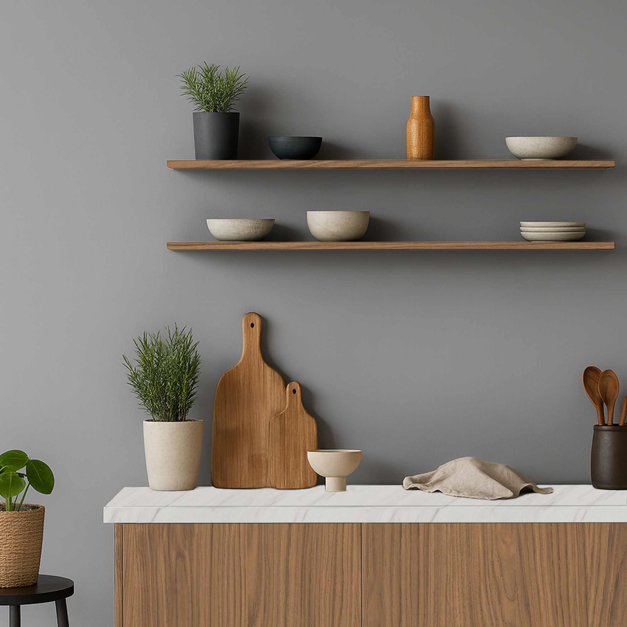 De 18 mm dunne zwevende wandplank op maat Casella Eik Bruin (H1386 ST40) is een natuurlijke en warme houtlook plank die volledig blind wordt gemonteerd. Met het Italiana Ferramenta Triade Pro systeem hangt de plank strak tegen de muur zonder zichtbare dragers.