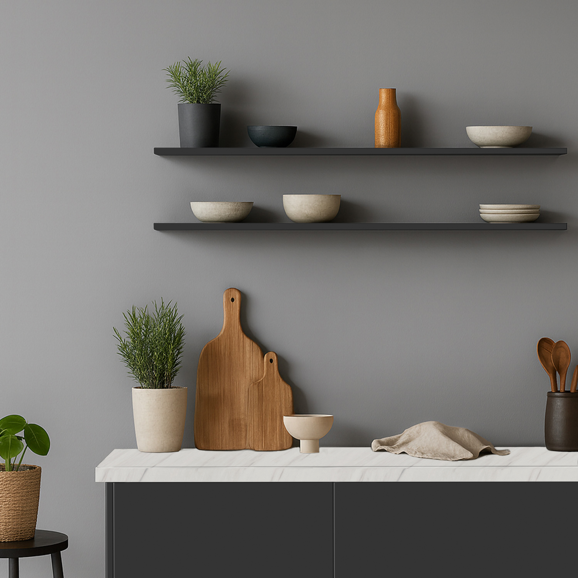 De 18 mm Diamant Grijs plank (U963 ST15 RAL7024) heeft een diepe, luxe grijstint en wordt volledig blind gemonteerd met Triade Pro.