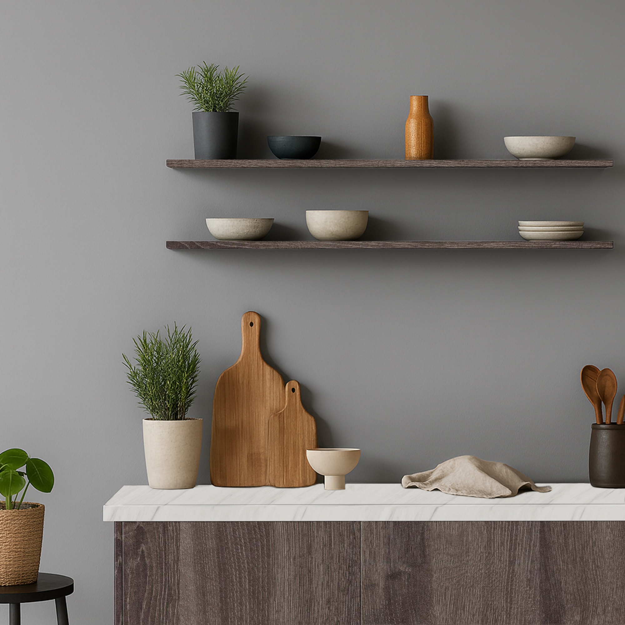 De 18 mm dunne zwevende wandplank op maat Sherman Eik Antraciet (H1346 ST32) biedt een robuuste, donker eikenhoutlook met volledige blinde montage. Dankzij de Triade Pro Blinde Plankdrager hangt de plank strak tegen de muur zonder zichtbare dragers.