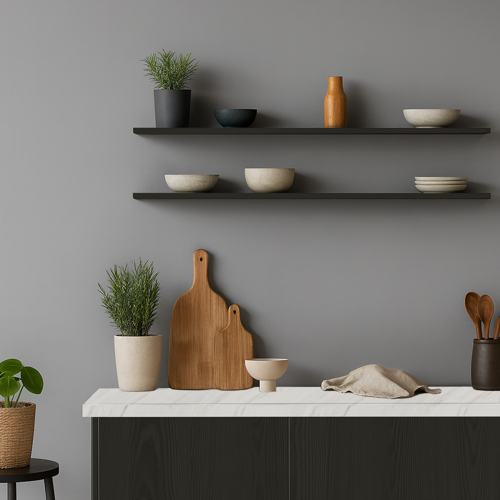 Met de 18 mm Zwart Eiken plank (U998 ST38 RAL9005) creëert u een strak en luxe zwevend wandmeubel.
